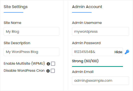 - Admin Username: Your new WordPress username (for security reasons, do not use the administrator or the admin username).