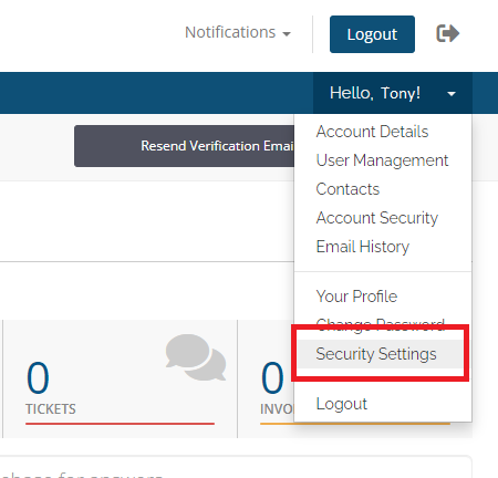 - Once logged in, navigate to "Hello, [Client's Name!]" than click on "Security Settings".